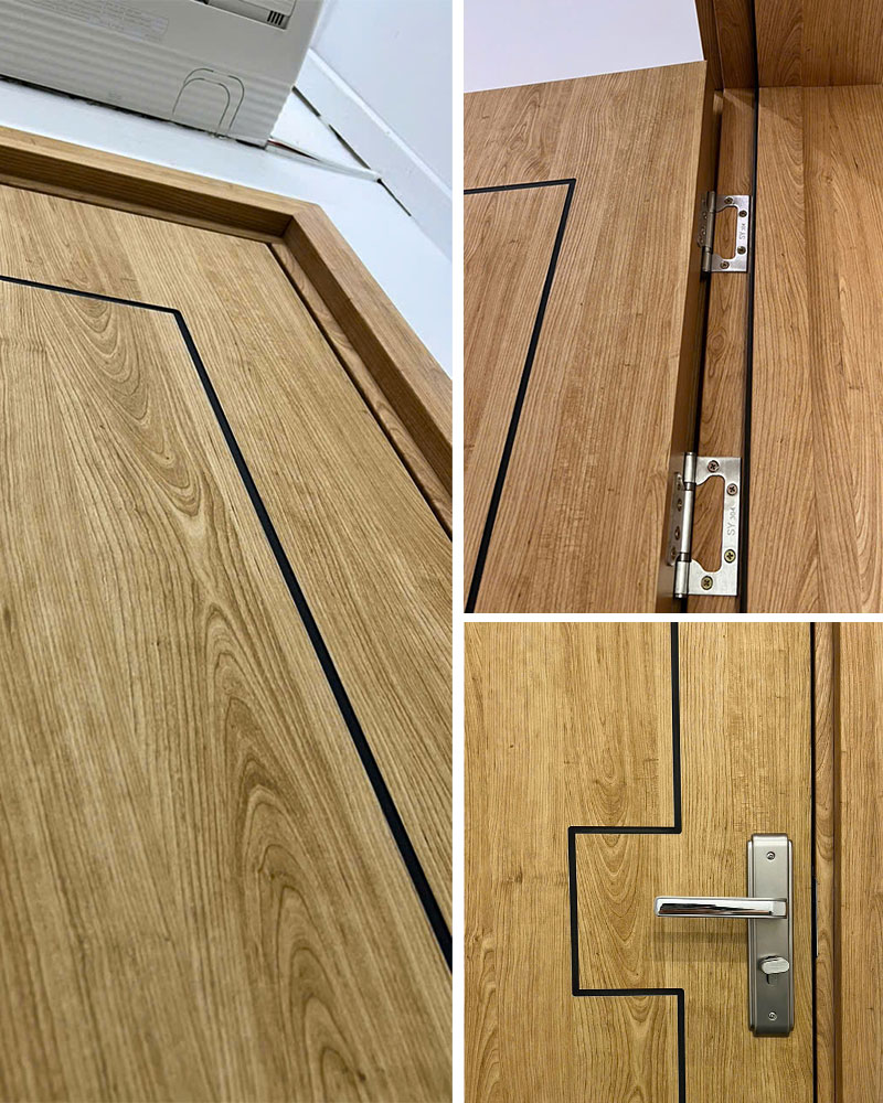 + Cánh cửa có độ dày 40 mm: 2 lớp bên ngoài bề mặt phủ film PVC vân gỗ với màu sắc khác nhau. Bên trong là lớp gỗ nhựa Composite đan xen thành tấm dạng Panel. Bề mặt cánh cửa có thể hút huỳnh, đắp phào chỉ nổi, thêm ô kính …tùy thuộc vào sở thích và nhu cầu của khách hàng.