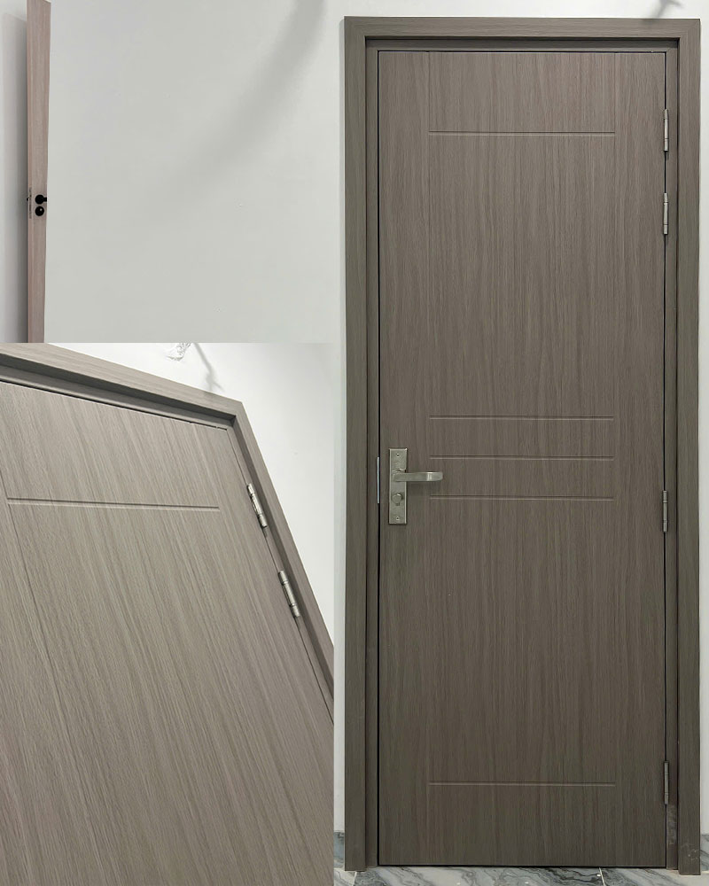 – Khuôn bao cửa: Vật liệu composite gỗ nhựa composite định hình mặt ngoài phủ phim PVC vân gỗ theo màu định trước, gioăng cao su cách âm và đóng êm. Có 2 loại khung bao cửa cho khách lựa chọn, khung bao cố định và khuông bao co giãn đi kèm nẹp L.