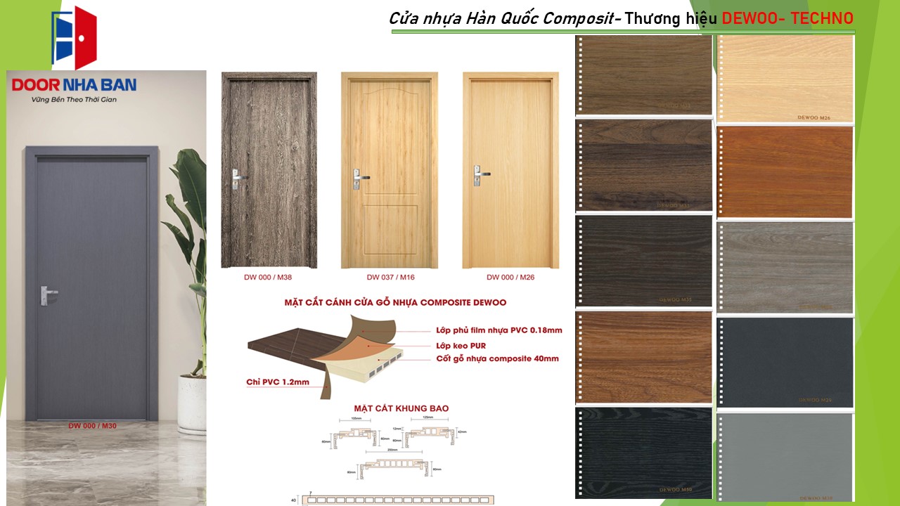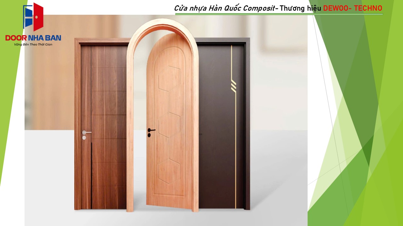 Cửa gỗ nhựa composite cung cấp bởi Door Nha Ban được tổng hợp từ thành phần gồm 70% nhựa và 30% bột gỗ tạo nên loại vật liệu giống gỗ nhưng chịu được nước và mối mọt tốt như cửa nhựa.